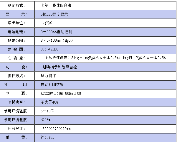儀器符合GB/T7600;SH/T0246;GB/T606及采用卡爾—費休法測定樣品中水分的有關標準,儀器采用了先進的自動控制電路,電解電流自動跟蹤控制,外型結構新穎,從而使該儀器工作更可靠,使用更方便,具有分析速度快(一分鐘出結果)、操作簡便、精度高、自動性強等特點,同時具有自動打印功能,可將實驗結果、做樣時間、樣品編號自動打印出來,廣泛應用于石油、化工、電力、鐵路、環保等部門。
