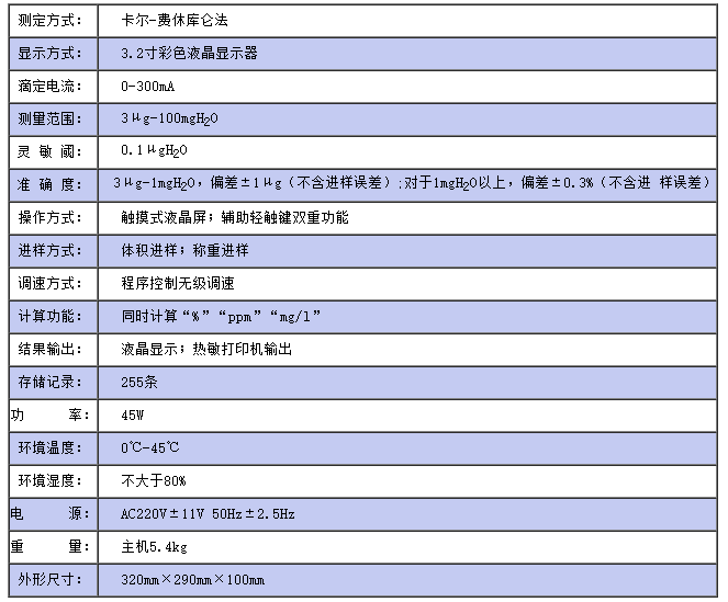 儀器符合GB/T7600及采用卡爾—費休法測定樣品中水分的有關標準, 是采用先進技術(shù)研發(fā)的,全新的具有人機對話功能新一代水分測定儀器。該儀器采用了雙CPU控制、彩色液晶顯示、觸摸屏控制、中文菜單,具有電極開路、短路報警等故障自檢功能,可儲存255條信息,具有自動計算百分含量、PPM值、自動打印功能。